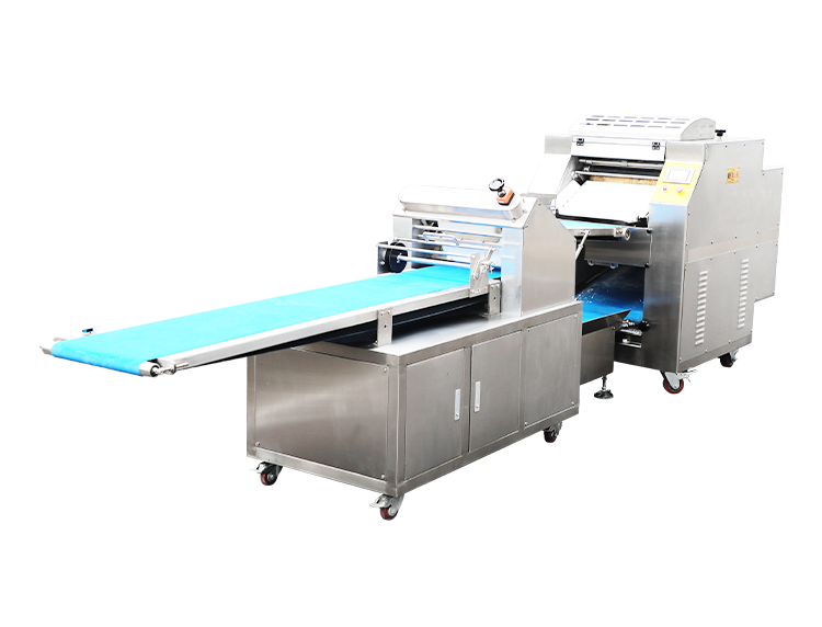 The intelligent automatic and continuous dough pressing unit is made up of continuous dough pressing machine anddough slice separating machine.Dough pieces are delivered automatically to dough pressing machine, S-shape continu-ous folding pressing can increase the toughness of dough skin, fineness and gloss. lt is allowed to set the frequency otpressing (1-99 times), shutdown time (0-60 seconds) and adjust the thickness of dough slice (0.8-1.8mm). Automatipowder sprinkling system can arrange the volume to reduce labor intensity and ensure safe operation. The well-preparelough slice will be delivered to shaping separating machine and dough pressing machine will return to its position.Theshaping separator can adjust the thickness and width of dough slice, convenient for forming machine operation.makingproduct weight and shape stable and further expanding dough slice. Cutters can be added to cut dough slice for multiple