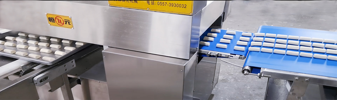 面皮經(jīng)過(guò)兩道壓面輪及撐面裝置之輾壓延展,使面皮更有光澤、品質(zhì)更加穩(wěn)定:每道壓面輪皆有厚薄調(diào)整裝置來(lái)設(shè)定面皮之厚度以增加或減少產(chǎn)品之重量;面皮在主機(jī)輸送帶上,由自動(dòng)開(kāi)花器對(duì)面皮進(jìn)行條狀、網(wǎng)狀等開(kāi)花;面皮再經(jīng)由  卷輪及輔助卷輪將面皮卷成條狀;卷面的過(guò)程中可以加餡;若欲生產(chǎn)切塊產(chǎn)品,可打開(kāi)切臺(tái)電源,并設(shè)定其切斷長(zhǎng)度以決定產(chǎn)品之長(zhǎng)度尺寸及重量大小;具同步調(diào)速功能,操作更加方便;成型機(jī)可做加餡漢堡、酥餅等;生產(chǎn)出的成品加上自動(dòng)排盤(pán)機(jī),操作更加方便。主要用于生產(chǎn)各類面包、漢堡、酥餅,如法式小面包、法式軟面包、毛毛蟲(chóng)面包、龍蝦卷面包、蜂巢面包、拉絲面包、長(zhǎng)棍面包、夾餡切塊面包、夾心漢堡、瑞士卷等。