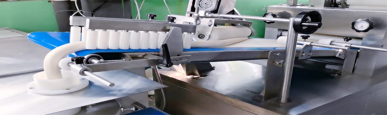 面皮進(jìn)行 條狀、網(wǎng)狀等開花;面皮再經(jīng)由卷輪及輔助卷輪將面皮卷成條狀;卷面的過程中可以加餡;若欲生產(chǎn)切塊產(chǎn)品,可打開切臺(tái)電源,并設(shè)定其切斷長(zhǎng)度以決定產(chǎn)品之長(zhǎng)度尺寸及重量大??;